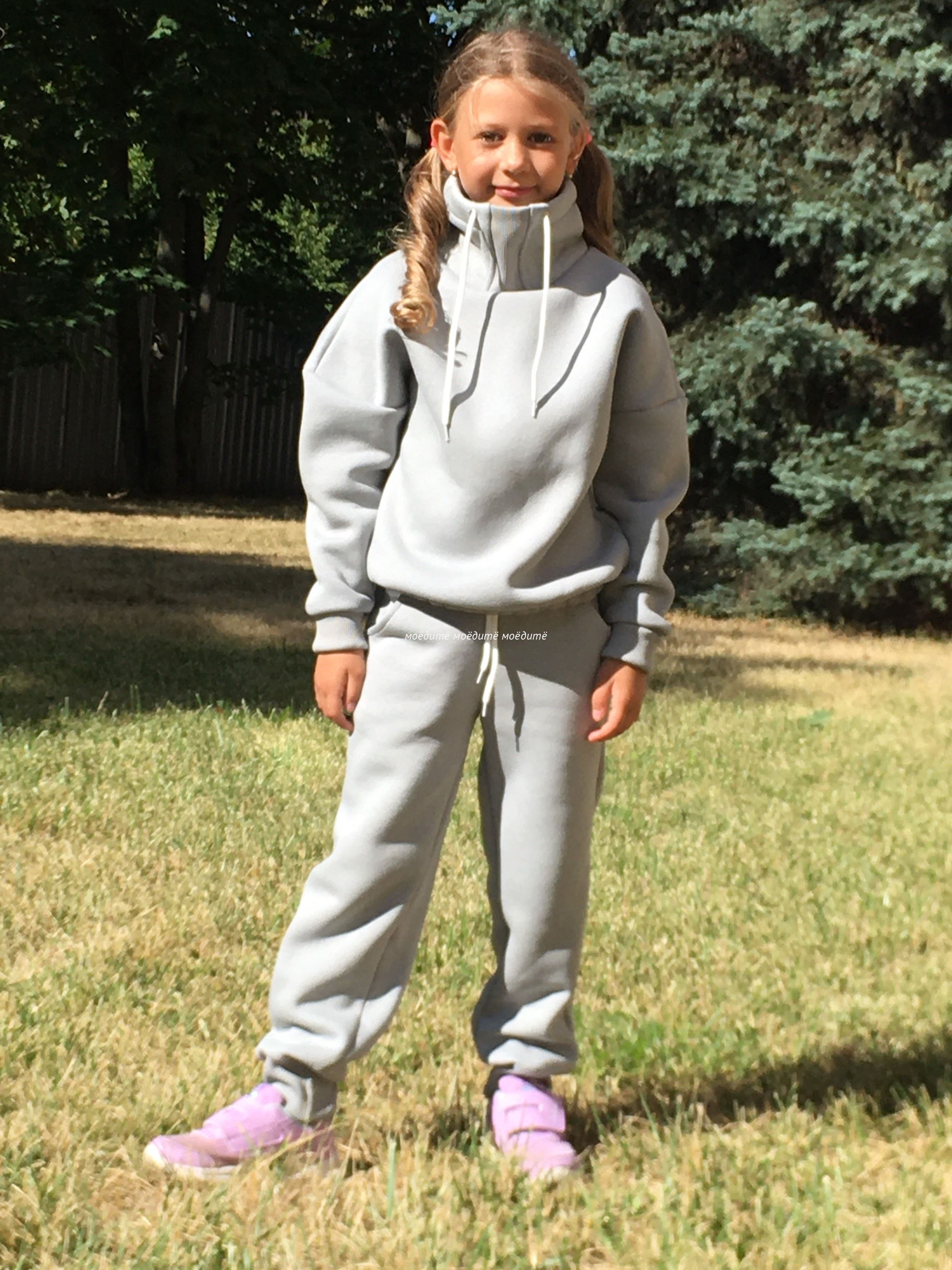 Костюм выполнен из футера 3-хнитки с начёсом. Состоит из свитшота и брюк. Брюки сверху на широкой резинке и со шнурком, снизу на манжете с отворотом. Свитшот с воротником-стойкой, украшен шнурком, снизу вставлена резинка, рукава на манжетах с отворотом.